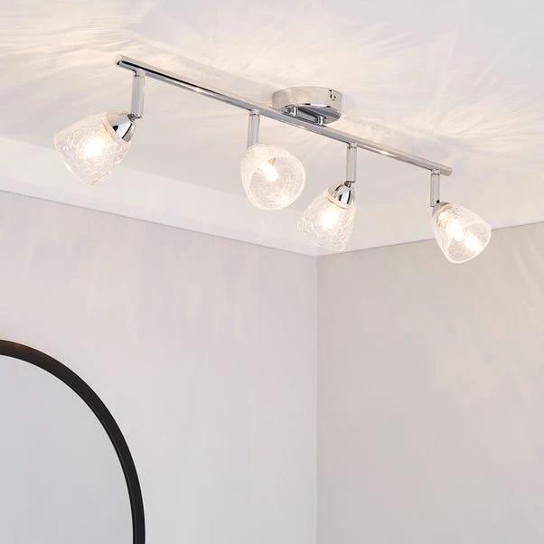 Stylishly crafted with a chrome finished base and adjustable heads, this stunning dimmable spotlight features four lights with decorative crackle glass shades.