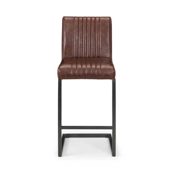Featuring an industrial, retro design, these bar stools are upholstered in vintage faux leather and supported by a cantilever-style gunmetal leg frame. The padded seat provides maximum comfort, making these stools a perfect choice for both casual and formal settings.