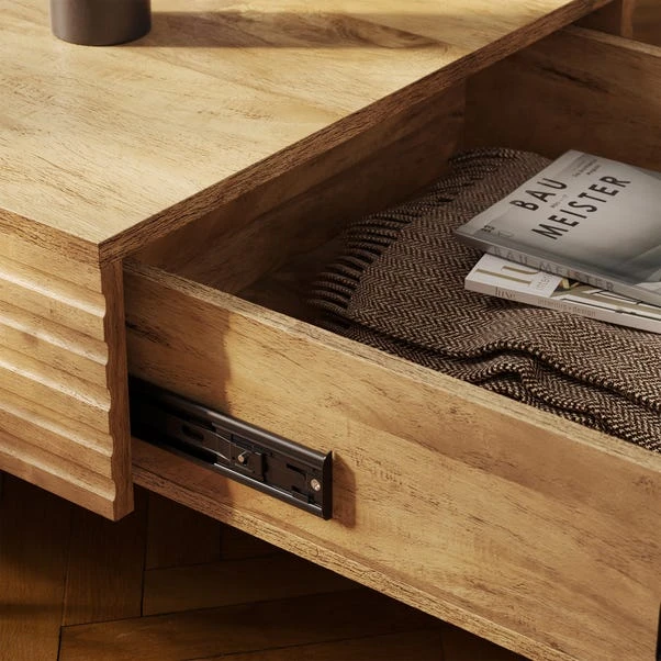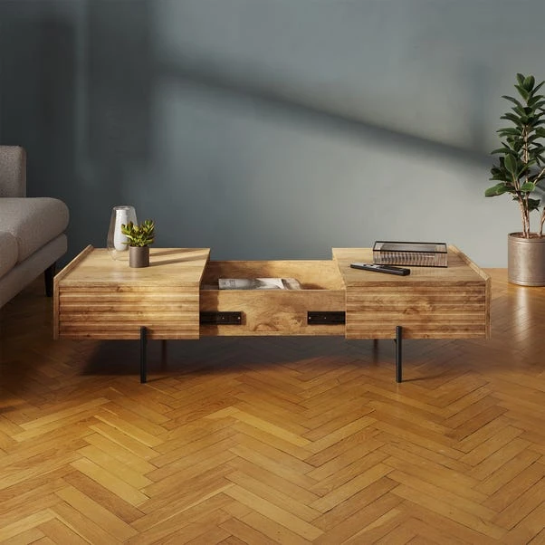 Experience a masterpiece of practicality and style with the Bryant Coffee Table, meticulously crafted to meet your storage needs and the perfect addition to any modern living space. With its sleek sliding top panels, you can easily access the large storage space within, making it the perfect solution for those who value convenience. The soft close mechanism ensures a smooth and gentle closure, so you can store your belongings without any hassle and the sleek metal legs provide a perfect contrast with the warm wood effect finish, creating a striking look that adds to the overall aesthetic appeal.
