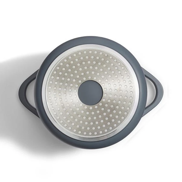 Constructed with robust cast aluminum, this 4.85-liter casserole dish efficiently accelerates heat and ensures uniform distribution, reducing cooking times. Displaying a stylish green glazed exterior and a sophisticated grey interior, it comes complete with a stainless steel base, rendering it compatible with all hob types. Additionally, the casserole dish is fortified with a dual layer of non-stick, scratch-resistant coating and features a dimpled lid for self-basting. Its oven-safe design adds versatility, catering to various cooking methods, including basting.