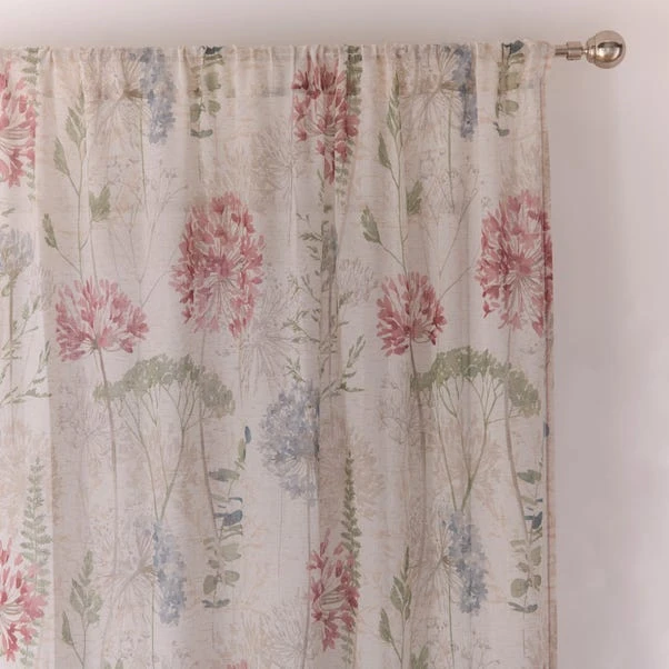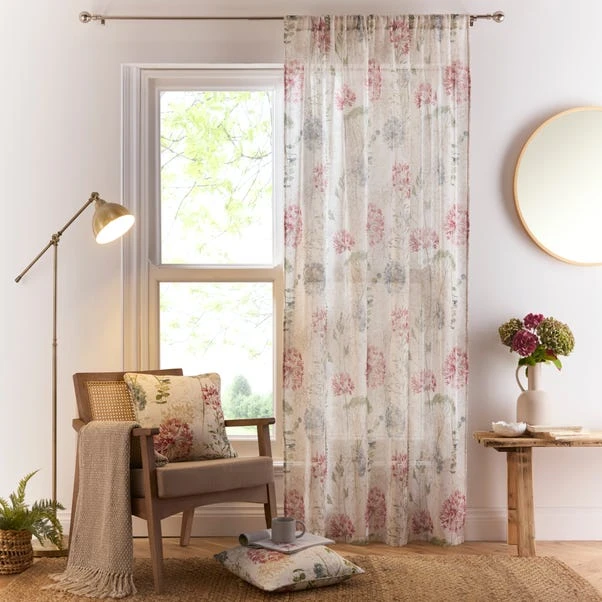 Meet the Country Meadow Slot Top Voile Panel, which features a beautiful floral design with accents of blue, pink, and natural tones. Printed onto a linen blend woven fabric, it offers a lovely drape and lightweight feel for any room.