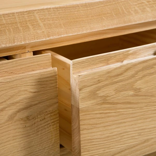 Crafted from solid oak and oak veneers, this chest of drawers is the perfect combination of classic and contemporary. With beautiful recessed handles and curved edging this chest of drawers is stunning. With 5 drawers this chest of drawers is perfect for holding all your clothes. Other matching furniture is also available.