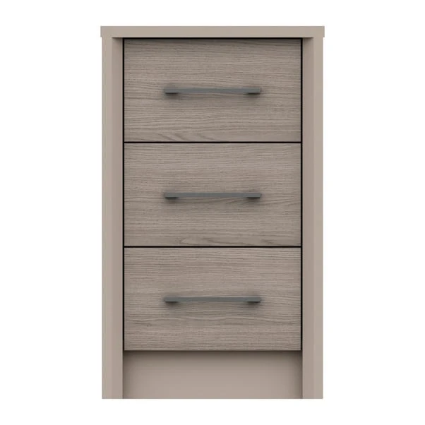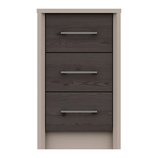 Crafted with a fired earth coloured carcass with complementing grey oak effect drawer fronts, the Dolan 3 drawer bedside table would make a stylish addition to any bedroom. This modern bedside features three spacious drawers complete with stylish brushed pewter finished slim handles, linen-look drawer insides, 8mm heavy duty bases and easy glide runners for ease of use.