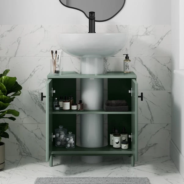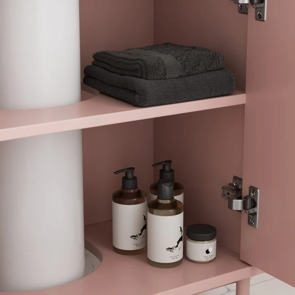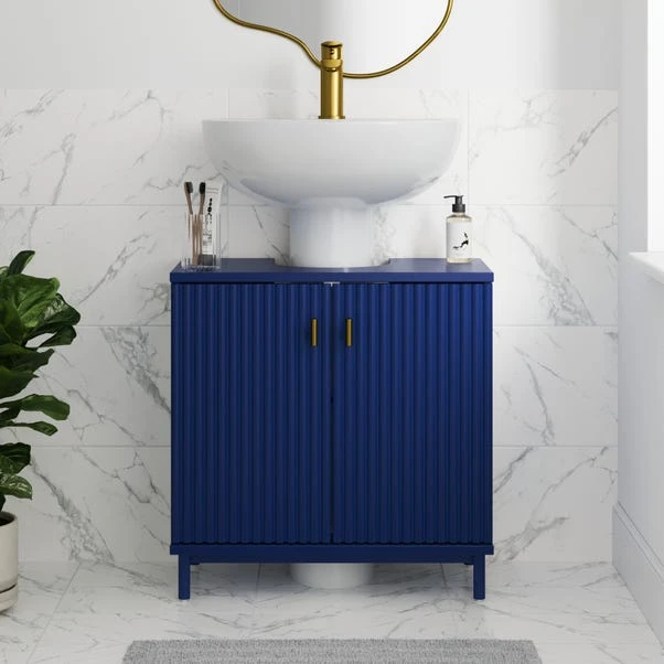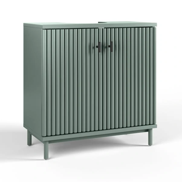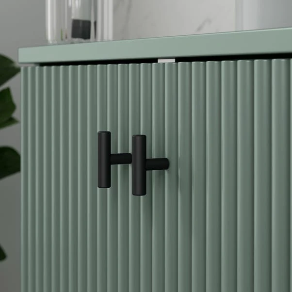 This unit is equipped with soft-closing doors and hinges for a touch of luxury and safety. Its modern fluted texture front, matte painted finish, metal leg base, and hexagonal handles create a chic and contemporary look, while the adjustable internal shelf provides customizable storage options.