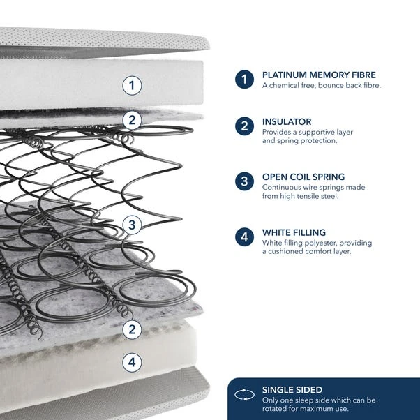 Carefully crafted, this mattress seamlessly combines the reliability of open coil springs with the cutting-edge comfort of memory foam. Prepare to be gently cradled by its plush layers as it contours to your body’s unique shape, offering unparalleled support and cushioning throughout the night. Plus, with hypoallergenic properties, it ensures a clean and healthy sleep haven, perfect for even the most sensitive sleepers.