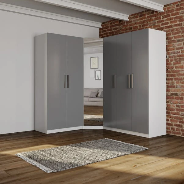 This Sudbury 3 Piece Large Mirrored Corner Wardrobe Set features an extra-height wardrobe with a vertical build system, internal shelves, and sturdy metal door hinges. With gloss fronts in grey or white, the set includes 1 corner wardrobe, 1 double wardrobe, and 1 triple wardrobe, offering both functionality and modern style.