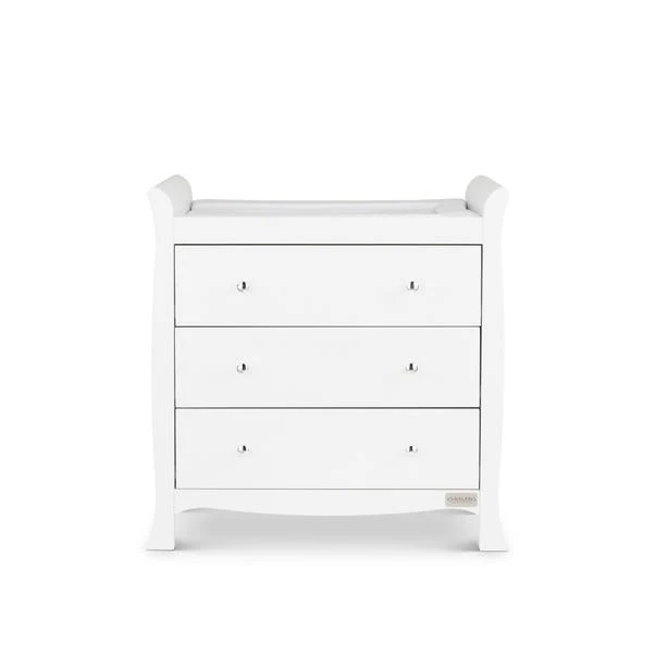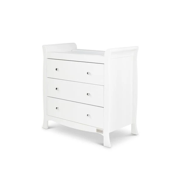 The Ickle Bubba Snowdon changing unit will last throughout the first few years of your newborn’s life, an investment that is really worth it! On the top is a changing unit that can fit mats up to 76cm x 46cm. Don’t worry if things get a little messy, the unit’s surface is easy to wipe clean. When your child grows out of nappies, the changing top can be removed, transforming the unit into a regular chest of drawers. The elegant handles add the perfect finishing touch to this unit.