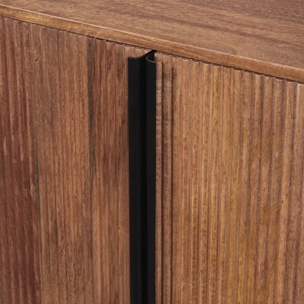 The Indus Valley Zen 2 Door 3 Drawer Sideboard features an elegant Zen oval design with a ribbed finish, complemented by black iron legs, providing ample storage with 2 doors and 3 drawers for your living space.