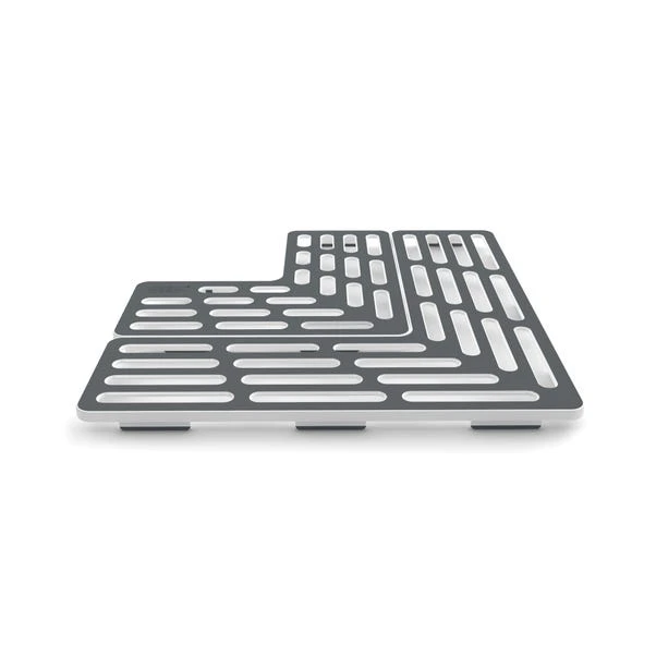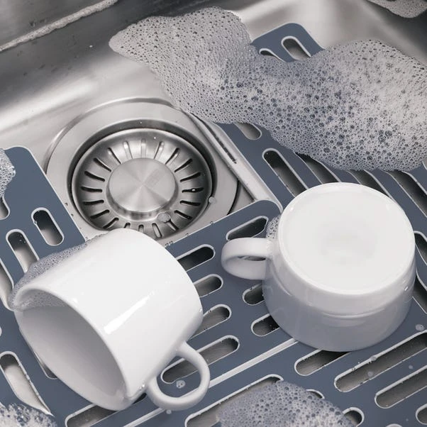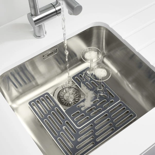 Designed to safeguard sinks from scratches and chips, this grey Joseph Joseph adjustable sink saver adjusts to fit different plug positions and locks neatly together and benefits from a manoeuvrable surface allowing water to drain and air to circulate quickly and efficiently.