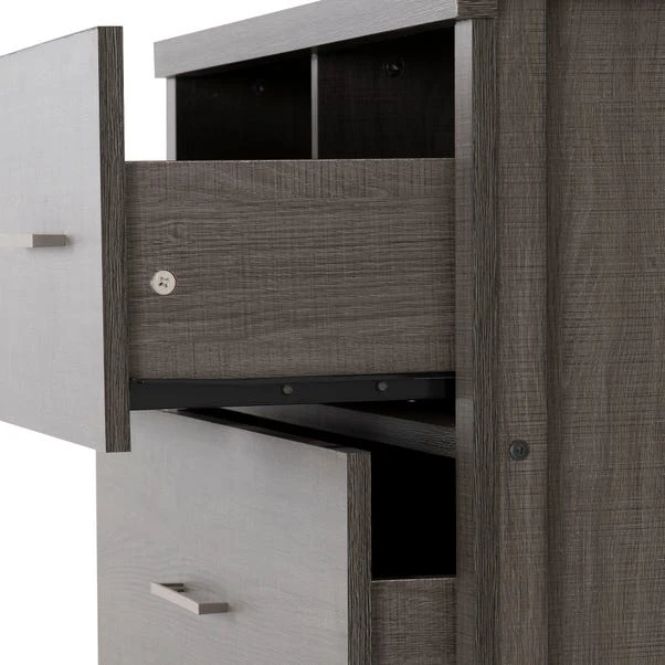 The Lennon 5 Drawer Chest is part of the affordable and practical for the home. The veneer finish is versatile for both modern and traditionally styled homes and also offers ample storage space.