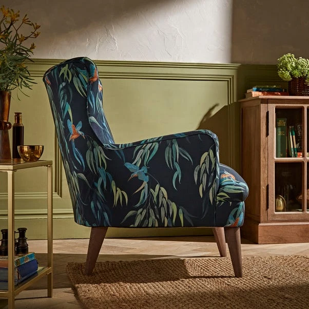 Our Marlow Wing Chair is finished in a stunning Kingfisher Print, inspired by the wetland habitats and the animals that thrive in these complex ecosystems. The classic wingback silhouette paired with the timeless wood legs provide a look that suits any home and is sure to stand the test of time. This armchair can be purchased with a matching footstool for even greater comfort. Made with responsibly sourced timber, you can relax the night away in style and with good conscience.