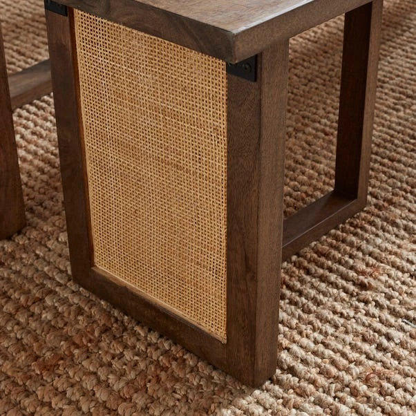 Crafted from solid mango wood, this dining bench oozes natural beauty and durability. The seat, adorned with cane detailing, adds a touch of texture and visual interest, creating a striking contrast to the sturdy wooden frame. This dining bench is not just a place to sit; it’s a statement piece that seamlessly integrates into various design styles, from farmhouse chic to contemporary elegance. Experience the warmth and character of mango wood combined with the timeless allure of cane, making this bench a distinctive and inviting addition to your dining area.