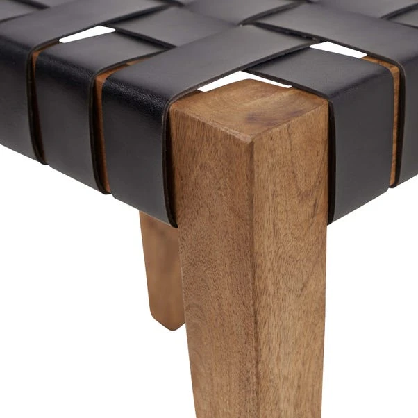 This set not only provides perfect occasional seating but also offers the advantage of nesting, allowing the two stools to comfortably fit under the bench when not in use. The real leather upholstery adds a luxurious touch, creating a refined seating ensemble. Handmade in India, this Claudio set seamlessly combines craftsmanship and functionality. The sleek mango wood and black leather combination, along with the nesting feature, make this set a stylish and space-efficient addition to any room, embodying both practicality and sophistication.
