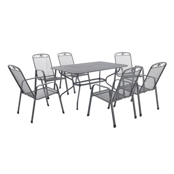 Elevate your garden with the Savoy 6 Seater Rectangular Dining Set. Featuring six dining chairs and a rectangular table, this set combines farmhouse charm with modern functionality. The floral design on the chair backs adds elegance, while the table has a hole for parasol placement. Made from premium steel with a Dark Grey finish, this set is durable and weather-resistant.