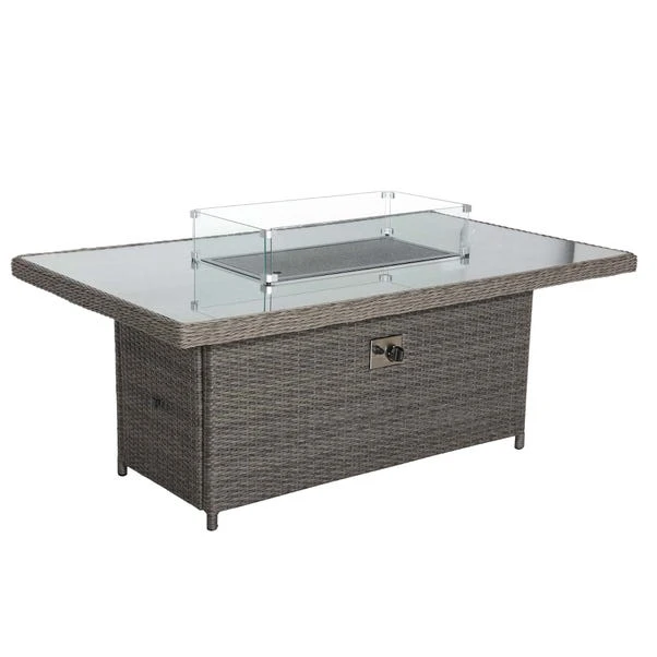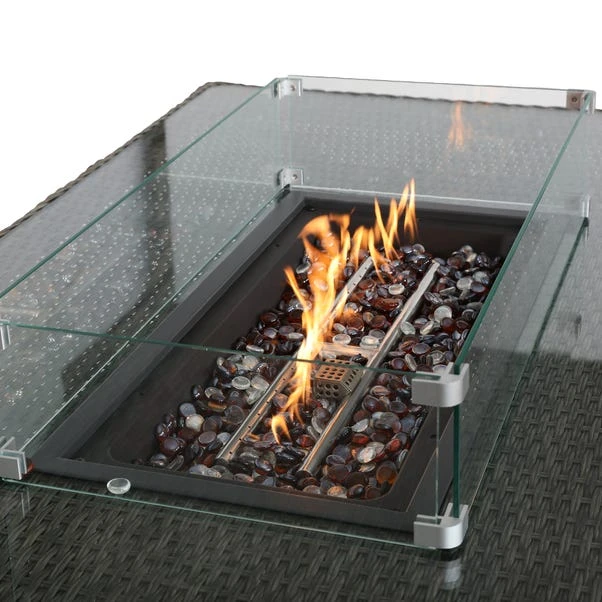 Featuring synthetic rattan with a contemporary slate grey colourway, the Paris Corner Dining Set will be a great modern seating addition to your outdoor space. Crafted with a rust proof aluminium frame, this set has a practical and space saving design. This set comes with a rectangle fire pit which has an adjustable flame. We recommend using a 5kg gas bottle when using the fire pit table. Cushions are included.
