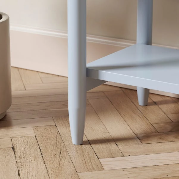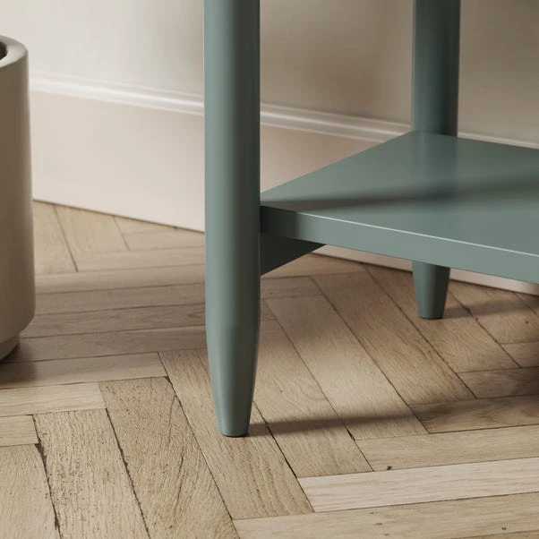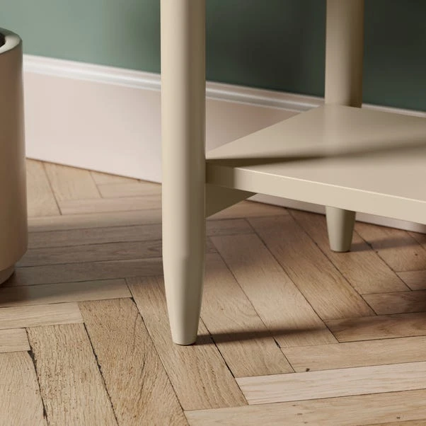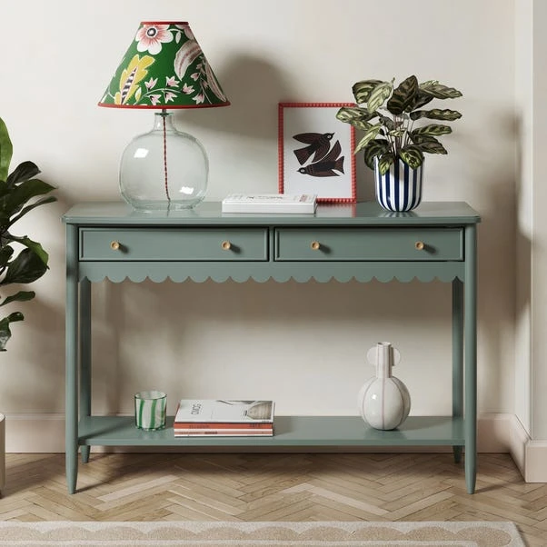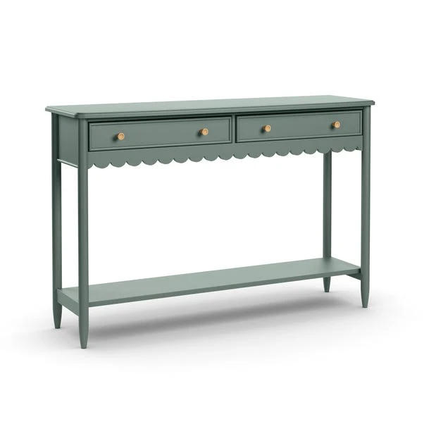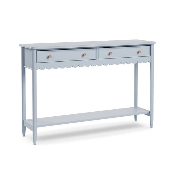 Make a statement in your living room, hallway or entryway with this beautifully crafted console table, an addition to your home that blends elegance, style and functionality. The standout feature of this console table is its intricately designed scallop detail and it’s refreshing painted finish, adding a touch of sophistication and character to any room. The turned and tapered legs further enhance its graceful appeal, providing a sturdy foundation that exudes charm. In terms of storage, this console table offers ample space to keep your belongings organised. It features two drawers with solid wood handles, allowing you to conveniently store and access smaller essentials. The door and drawer fronts beautifully complement the overall design, showcasing a perfect balance between style and practicality. For additional versatility, this console table boasts a spacious open shelf, providing the perfect spot to display your favourite decorative items, books, or even to house a small potted plant. This console table is crafted from solid wood, ensuring durability and longevity.