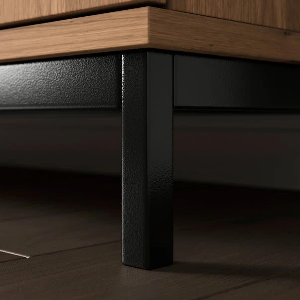 This tv unit is designed to accommodate larger televisions while providing ample storage and cable management. This TV unit features an interchangeable handle position for left or right configuration and includes a cable hole for easy wire organisation. The rustic oak effect finish adds a touch of natural elegance to your living room, while the spacious shelves and compartments offer plenty of storage for media devices, books, and decorative items.