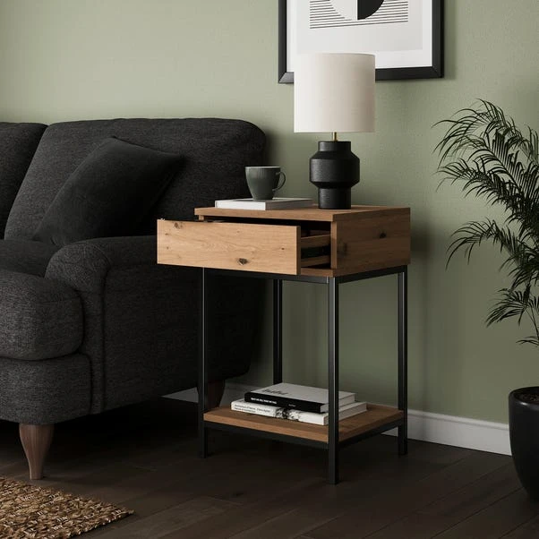This side table is both functional and aesthetically pleasing, making it a great choice for any home. Featuring an interchangeable handle position for left or right configuration, this side table can be customised to suit your needs. The rustic oak effect finish adds a touch of natural beauty to your decor, while the compact design makes it perfect for use as a bedside table or an accent table in your living room.