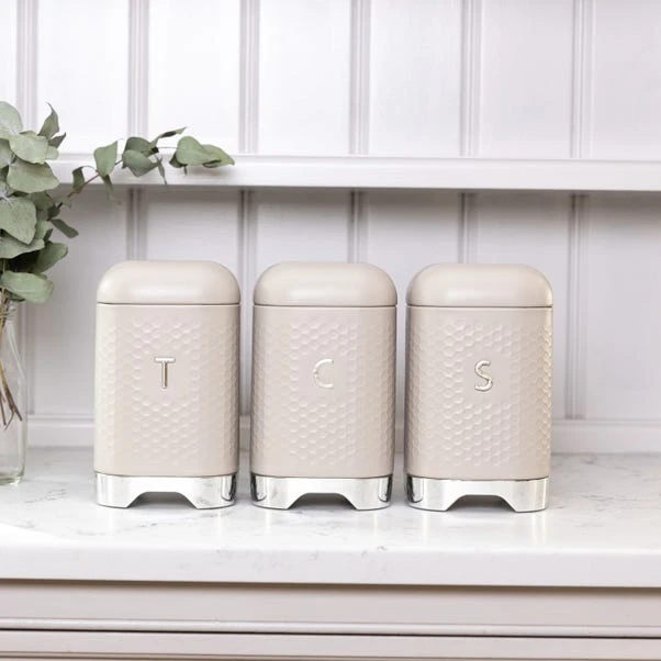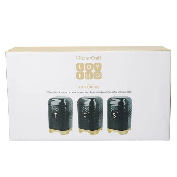 Elevate your kitchen organisation with the KitchenCraft Lovello Tea, Coffee, and Sugar Canister Set. These stylish storage jars add a touch of retro-modern charm to your counter, featuring a glossy shadow grey finish and a debossed geometric texture. Each canister is clearly labelled with a metallic ‘T’, ‘C’, or ‘S’, making it easy to grab what you need. The air-tight lids ensure your tea, coffee, and sugar stay fresh and full of flavour for longer. Made from durable carbon steel with non-slip feet, this set is both practical and sleek, protecting your surfaces while keeping things tidy. Easy to wipe clean, and backed by a 12-month guarantee, it’s a must-have for every kitchen.