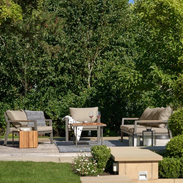 The Stockholm Lounge Set seats up to 5 people, presenting a teak table top, inlaid teak chair arms, and a powder-coated aluminum framework. With water-resistant cushions and easy assembly, it combines comfort with contemporary design for your outdoor relaxation.