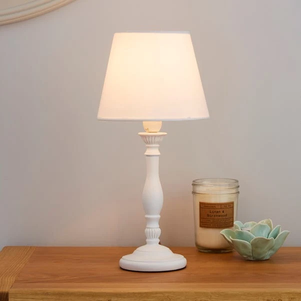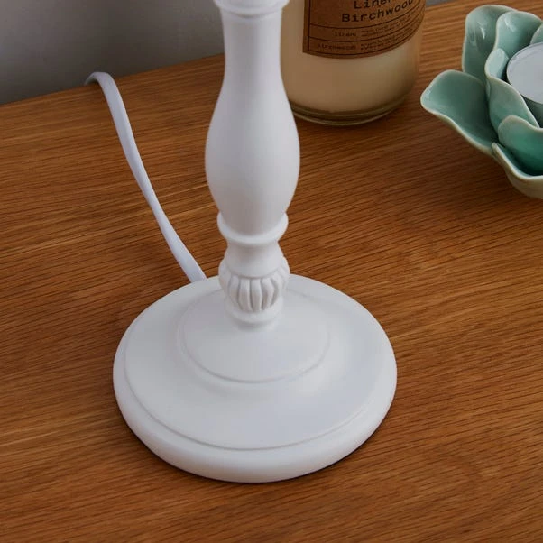 Finished with a soft tapered fabric shade in a choice of colours, this simple Tofty table lamp is crafted with a carved resin base.
