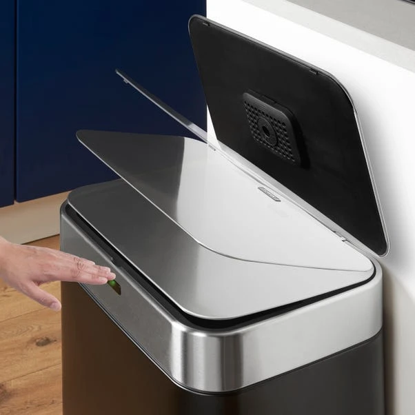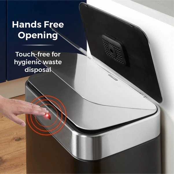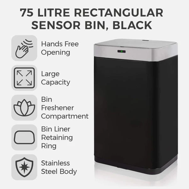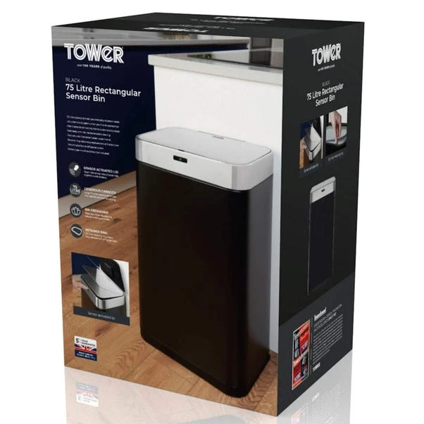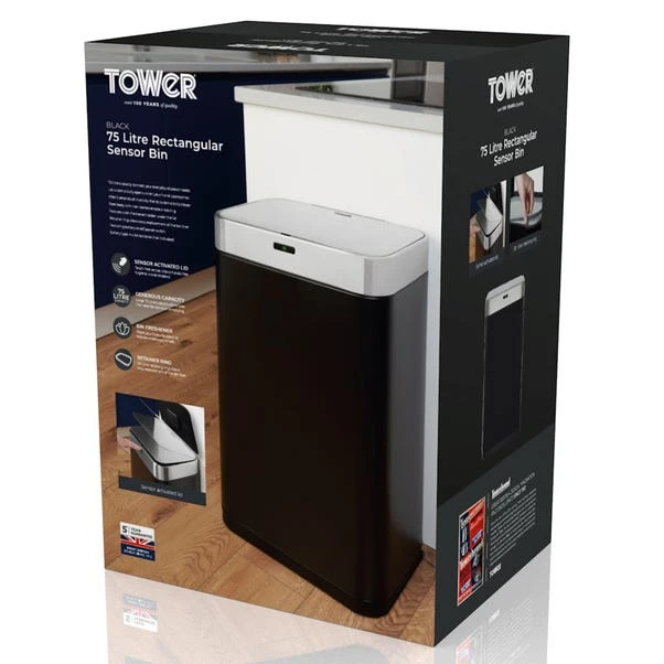 Crafted by Tower this 75 litre rectangular sensor bin features a robust stainless steel body with a modern black colour coating. Complete with a lid that automatically opens within 5 10 15cm, this bin includes a large hygienic opening for ease of placing waste. Supplied with a one year guarantee.