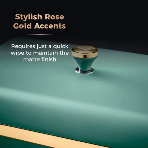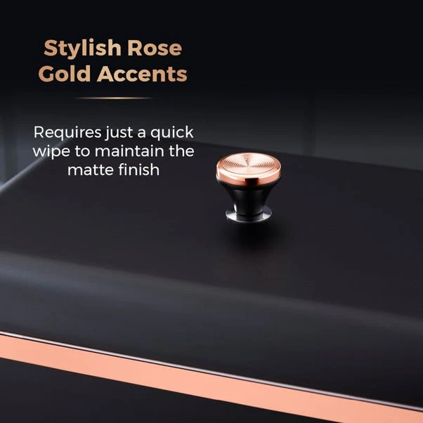 Store your bread in style with this contemporary bread bin from Tower with a fully removable lid, a stylish matte finish, a clean and compact design, and a durable carbon steel body. It comes in two different colours: grey and midnight blue. The bin is designed to keep your bread fresh, it has a large inner capacity and its sophisticated rose gold accents gives a stylish look to your kitchen.