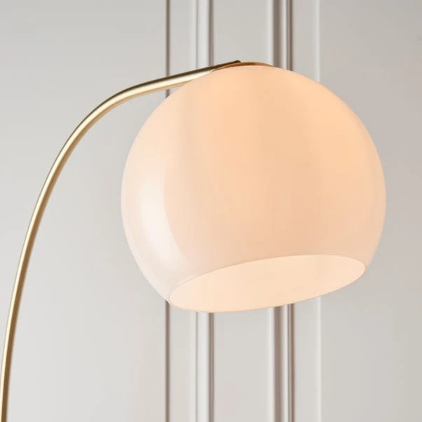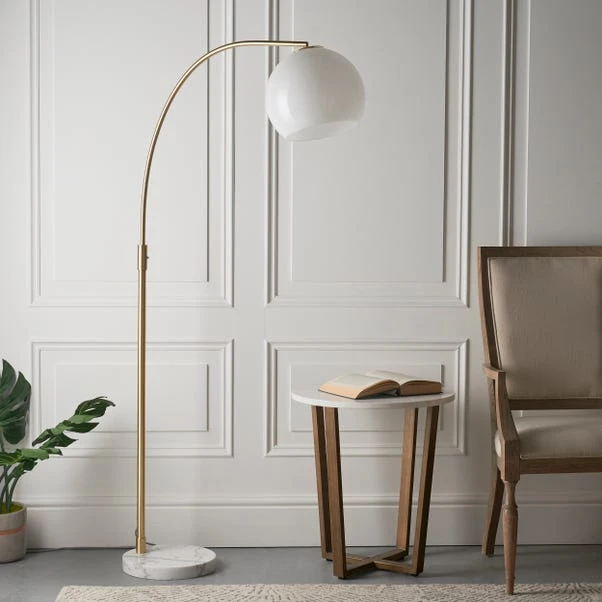 Inspired by mid-century style, the Vogue Hartwell floor lamp is designed with a blending gloss opal shade, in modern yet timeless style. Finished with a striking satin brass plated finish which adds a touch of luxe to the look. Complete on a sturdy grey marble base for a subtle contrast in colour.