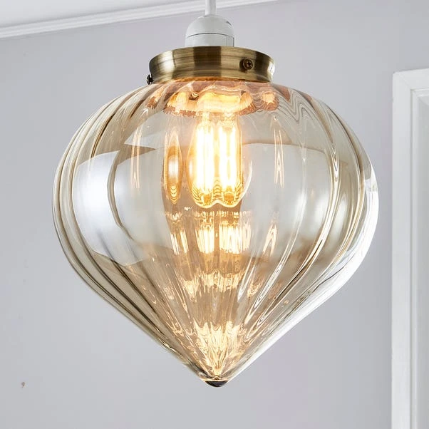 With its gorgeous timeless design, the Voyager easy fit pendant would make a stunning statement light shade in any home. Styled with satin brushed gold effect details and paired with a beautifully shaped, ribbed tinted real glass shade. This easy fit pendant is perfect for displaying statement bulbs and adding a feminine touch to any room. This piece is available in a choice of two colours to suit your space and matching family items are available to help coordinate your home. Easy Fit pendants are ideal for a quick style change without needing an electrician. Simply assemble on to your existing ceiling fitting, and you’re good to go within minutes! Don’t forget to choose the correct bulb for your ceiling fitting.