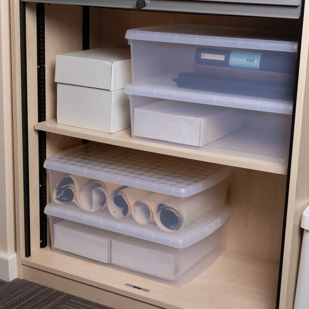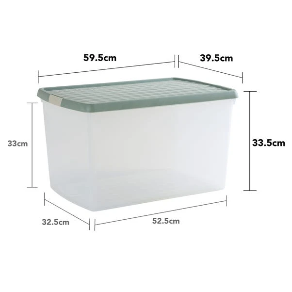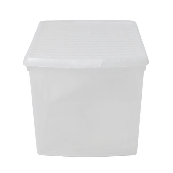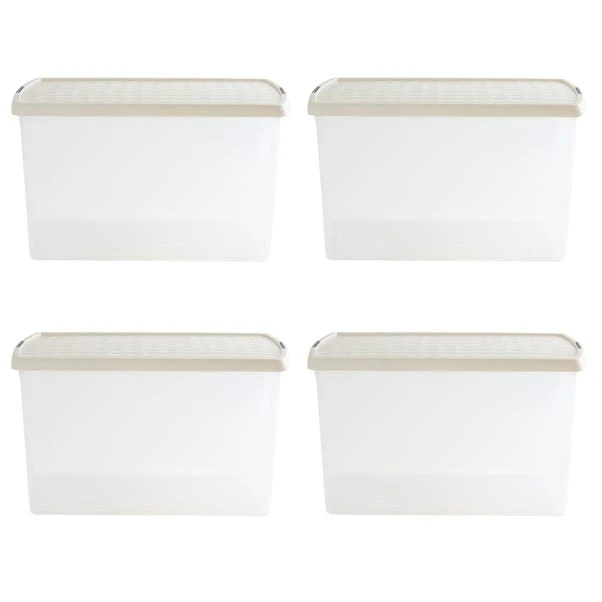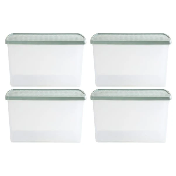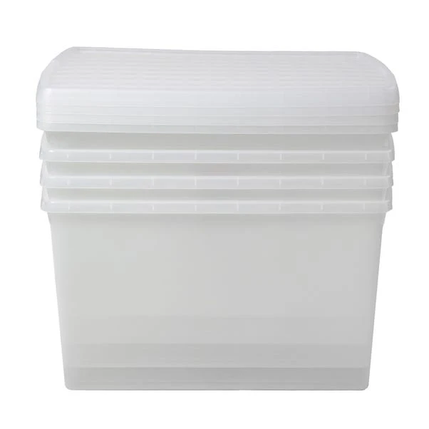 Tackle bulk storage efficiently with the pack of 4 storage boxes. These containers feature durable, clear bases to easily view contents, secure clip-lock waffle design lids, and a stackable design for practical use. Stylish and modern, they nest neatly when stored, providing a space-saving solution for your household items.