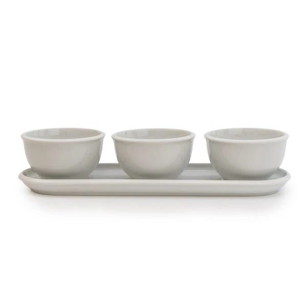 Add a subtle yet elegant touch to your dining collection with this classic white dip bowl set and platter. Beautifully crafted from porcelain this platter and dip bowl set is dishwasher safe and perfect for everyday or occasional use. This dip bowl set and the platter are the ideal essential for every home. Other matching dining accessories are also available.
