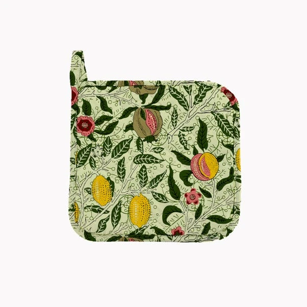 Ensure safety with a charming and practical addition to your kitchen essentials. Designed with a fun and colourful William Morris Fruit pattern, this pot holder seamlessly combines style with functionality. Tested to withstand temperatures up to 250 degrees, it offers reliable protection during your cooking endeavours. The quilted construction ensures both durability and heat resistance, providing a secure grip on hot pots and pans.